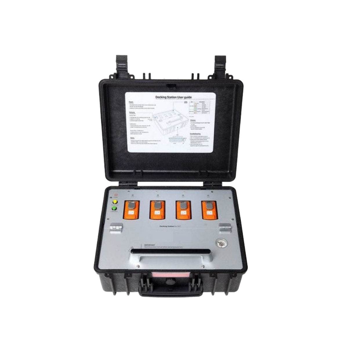 The docking station is built into a rugged hard casing suitable for tough industrial environments and frequent movement between locations. This robust construction makes it practical for use in vehicles, temporary work areas and multi-site operations where equipment is regularly transported.